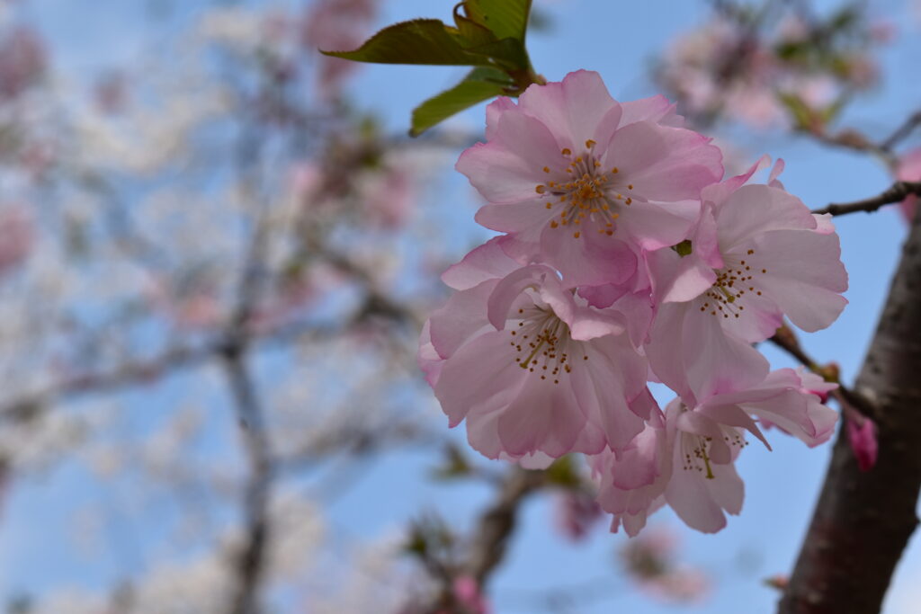 この桜の最大の特徴は二期咲きであることで、春(3月下旬〜4月)と秋(10月〜11月)の年2回花を楽しめます。特に秋にも桜が咲く珍しさから、近年日本でも街路樹や公園樹として人気が高まっています。花は淡いピンク色の半八重咲きで、一重咲きよりもボリューム感があり華やかです。花径は3〜4cm程度で、房状に複数の花がまとまって咲くため見応えがあります。